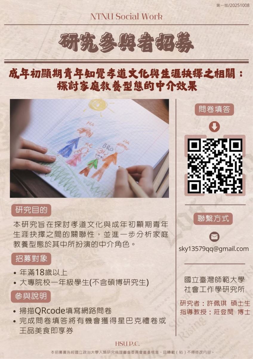 【受試者招募公告】誠摯邀請大一生填寫/轉發研究問卷|完成可抽禮券 大家好,我是國立臺灣師範大學社會工作學研究所碩士生許佩琪,目前在莊登閔老師的指導下進行碩士論文研究。 ㄧ、研究主題 「成年初顯期青年知覺孝道文化與生涯抉擇之相關:探討家庭教養型態的中介效果」。 二、研究目的 欲瞭解孝道文化與家庭教養型態對成年初顯期青年生涯抉擇的影響。 三、研究對象 年滿18歲、目前就讀大專院校一年級學生(不含碩士班與博士班)。 四、研究方式 請您協助填寫一份線上問卷(約需10–15分鐘)。 五、參與回饋 完成問卷的同學將有機會參加抽獎(每人限填答乙次),獎項包括: 星巴克禮券 200元(50名) 王品集團即享券 2,000元(1名) 誠摯邀請您參與本研究,您的填答將對學術研究與實務應用皆是寶貴的貢獻! 問卷連結:https://www.surveycake.com/s/PwlaA 感謝您的協助與支持! 國立臺灣師範大學社會工作學研究所 碩士生 許佩琪 敬上