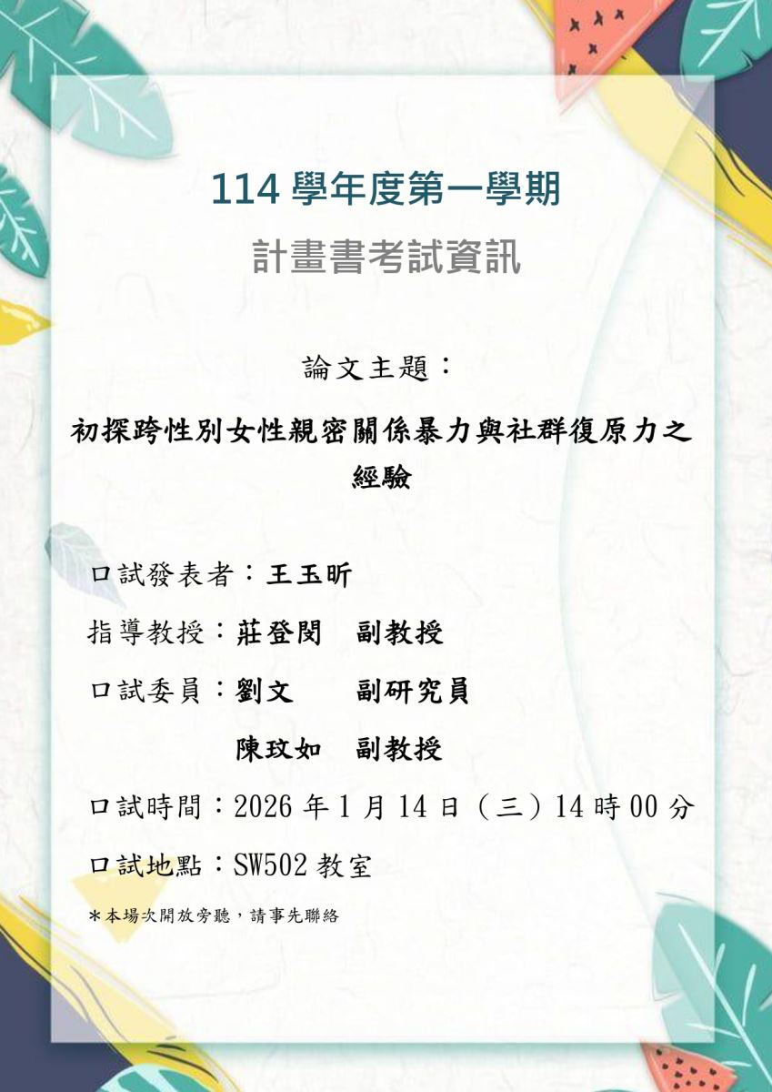 王玉昕同學 論文計劃書口試 : 初探跨性別女性親密關係暴力與社群復原力之經驗