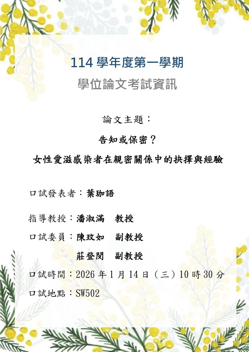 葉珈語同學 學位論文考試 : 告知或告密?女性愛滋感染者在親密關係中的抉擇與經驗