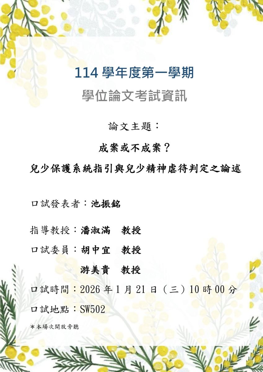 池振銘同學 學位論文考試 : 成案或不成案?兒少保護系統指引與兒少精神虐待判定之論述