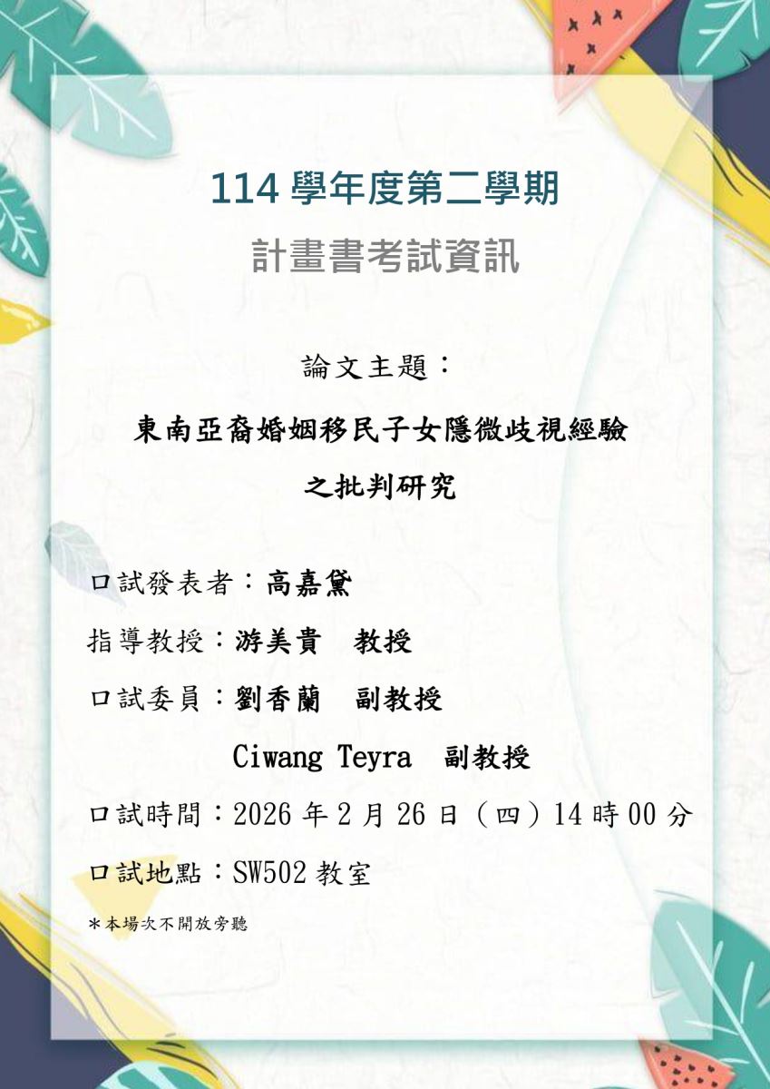 高嘉黛同學 論文計劃書口試 : 東南亞裔婚姻移民子女隱微歧視經驗之批判研究
