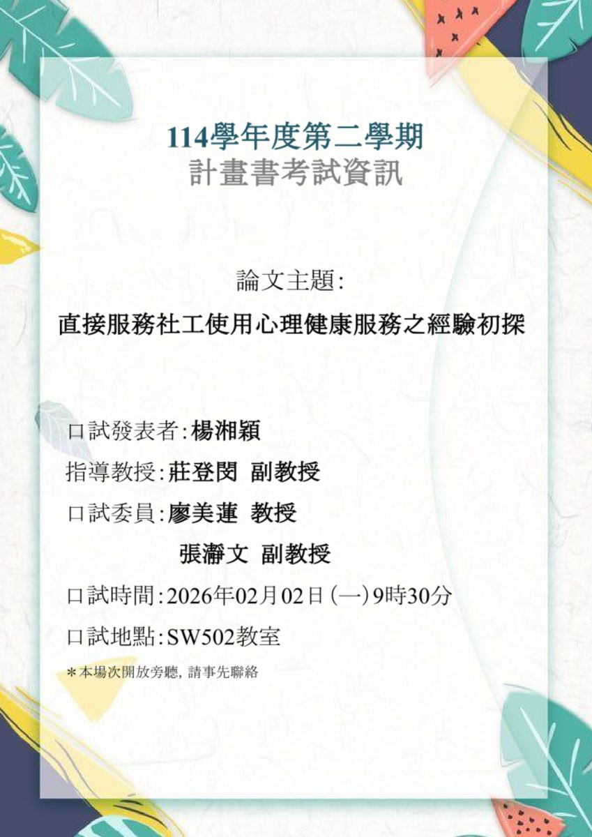 楊湘穎同學 論文計劃書考試:直接服務社工使用心理健康服務之經驗初探